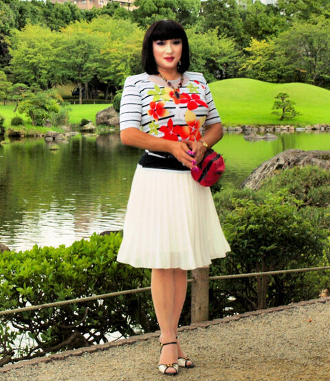今日の私のいでたちは、ボトムスは、白っぽいスカートで小さなプリーツが入ったフワッとしたものです。ミニスカートではなくて膝丈のスカートです。トップスは、パープルやローズピンク、クリームイエローなどのやや大きめの花柄があしらわれているデザインのブラウスで、ブラウスの地はライトなグレーで、ボウタイがついていてリボン結びにするようになっています。ブラウスの腕先が大きくフワッと広がっているパフ袖というタイプです。そのブラウスをスカートの中に入れています。 靴は、スカートの色に合わせて、白のパンプス。9センチぐらいのヒールがあるハイヒールです。ストッキングにつつまれた足がハイヒールにおさまっています。札幌の11月というとけっこう寒いので、ブラウスの上にはピンクのコートを羽織っています。このコートは、おつきあいしていた別の男性におねだりして買ってもらったものなので、私ってすごい悪女なのかなあ。